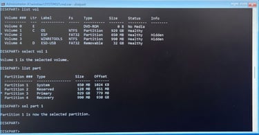 Enter list partition to check the partitions. I understand partition 1 is the System EFI default, but always check. In my case it was Partition 1 so we select that: select partition 1