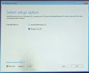 The next screen should be Select setup option, which in our case we should select Repair my PC