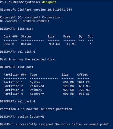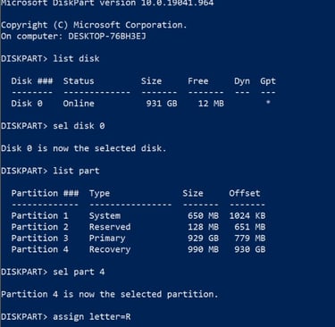 Finally, go back into DISKPART, select the Recovery partition we assigned a letter to and use the following command to remove that assigned letter