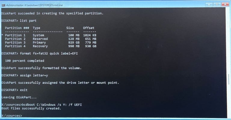 Finally, run this command to properly establish the system partition: bcdboot C:\Windows /s Y: /f UEFI