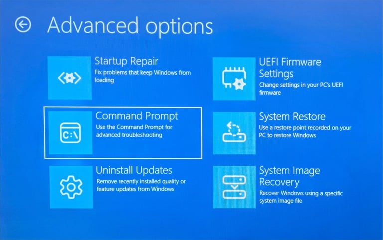 After selecting Repair my PC, you should be prompted to select the keyboard layout (select your preferred) and finally arrive at the Choose an option screen. From there Click on Troubleshoot > Command Prompt. It should look like this